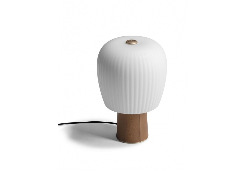 Nymph firmata da Sebastian Herkner per Poltrona Frau è una lampada da tavolo con base di forma a tronco di cono con struttura in ottone naturale rivestito in Pelle Frau®. Il paralume è di forma tondeggiante in vetro soffiato con lavorazione cannettata ed adotta un diffusore cilindrico in polimetilmetacrilato. La sorgente luminosa adottata è un modulo LED con accensione touch on/off e sistema di dimmerabilita. Nymph è disponibile in differenti finiture e modelli.