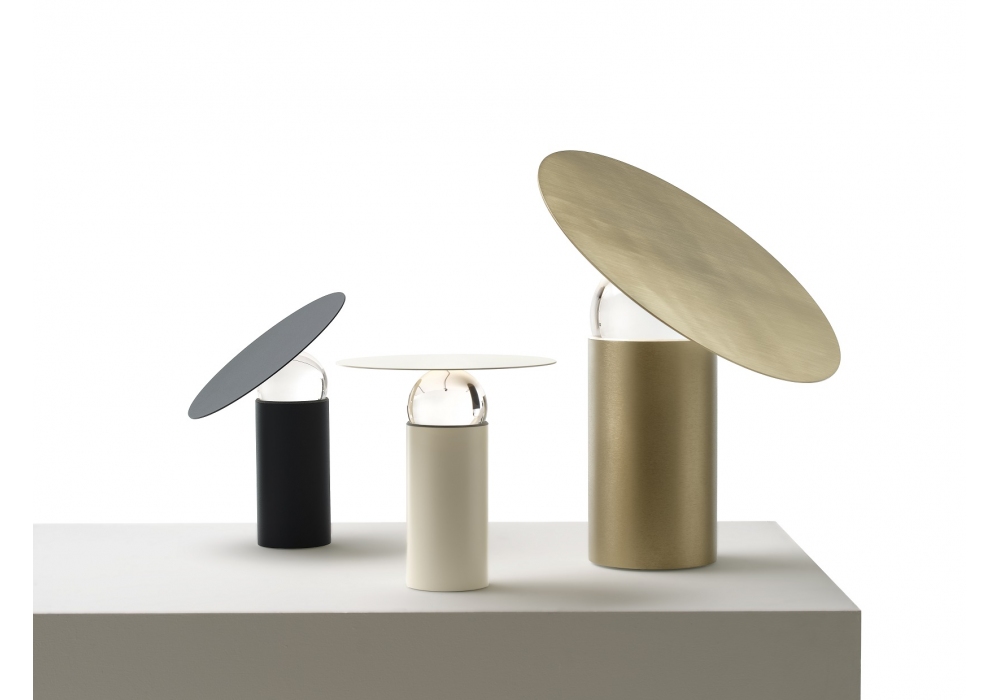 Era firmata da Budde per Mogg è una lampada da tavolo dimmerabile in metallo con sfera in cristallo e paralume orientabile. Disponibile bianco RAL1013, nero RAL9017 oppure oro satinato.