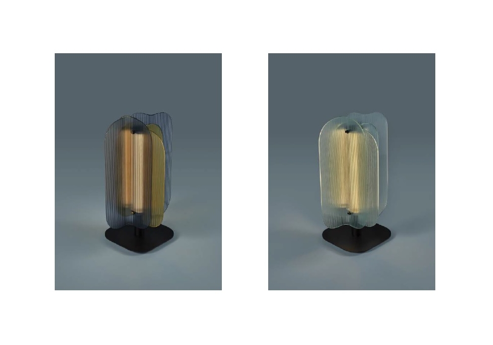 Fold firmata da Hoffmann Kahleys Design per Quasar è una lampada da tavolo. I suoi angoli ruotati e misteriosi rendono Fold unica. Gli angoli sono realizzati in sottile vetro rigato e sono disponibili in vari colori.