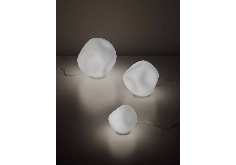 Hoba firmata da Ludovica e Roberto Palomba per Foscarini è una lampada da tavolo ispirata alla forma di un meteorite, asimmetrica in vetro soffiato opaco. Disponibile in diverse dimensioni.