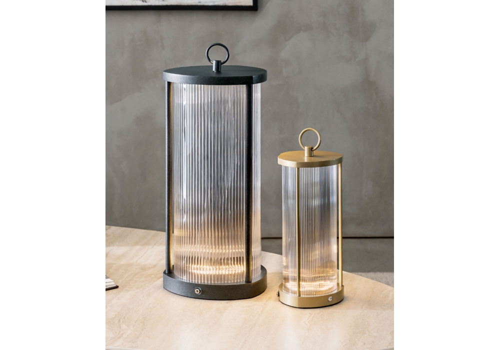 Giò Giò - TL firmata da Riflessi è una lampada da tavolo realizzata con struttura in alluminio e cilindro in metacrilato cannettato. Illuminazione con lampadina a LED a filamento. Disponibile in diverse finiture e dimensioni.