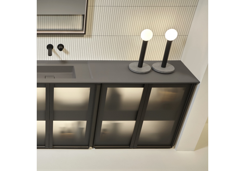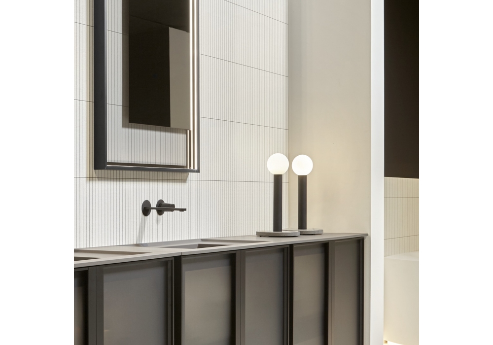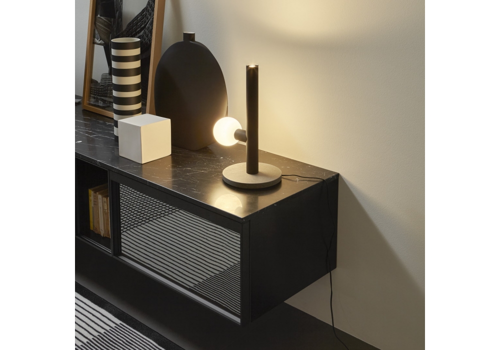 Apollo firmata da Antonio Lupi è una lampada da tavolo con illuminazione a LED realizzata con basamento in pietra Basaltina e struttura in ottone verniciato goffrato o bianco opaco.