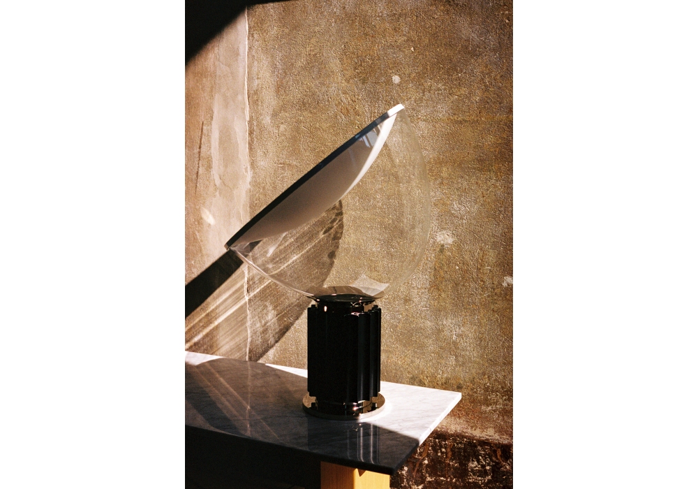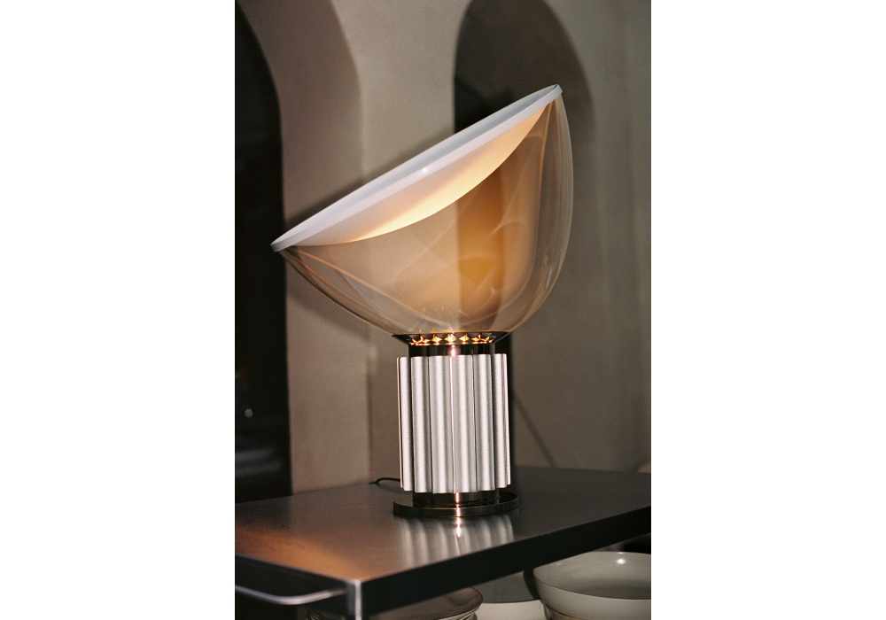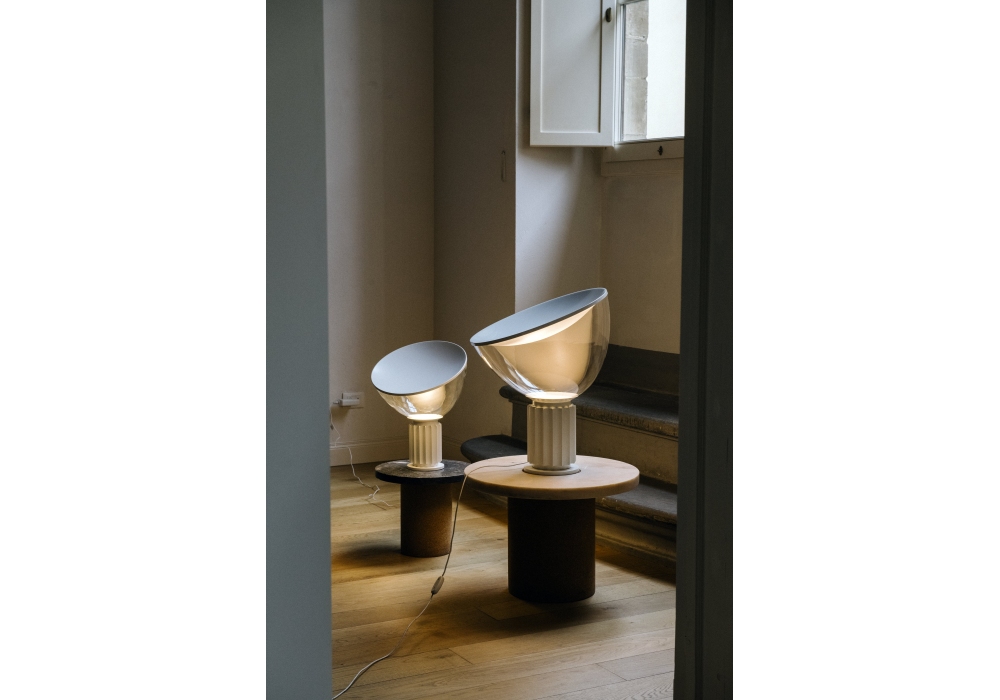 Taccia firmata da Achille & Pier Giacomo Castiglioni per Flos è una lampada da tavolo a luce indiretta e riflessa. Riflettore in metallo verniciato di colore bianco lucido a liquido internamente e bianco a polvere esternamente. Diffusore orientabile in vetro trasparente soffiato a bocca. Corpo in alluminio estruso verniciato. Base di acciaio lucidato, nichelato e zapponato. Dimmer e LED inclusi.
