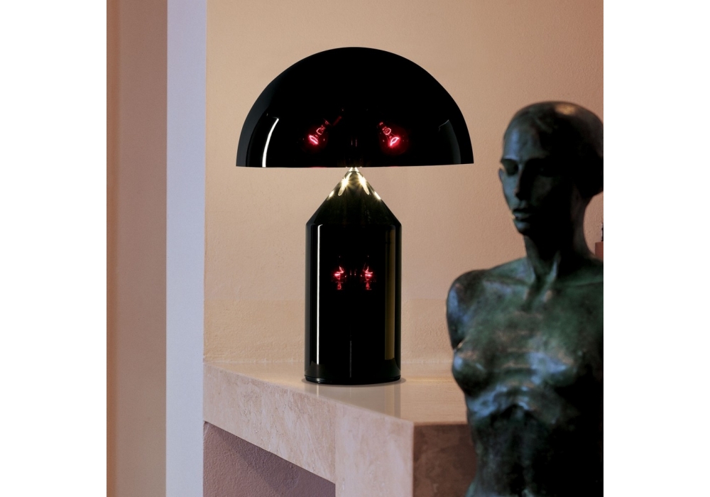 Atollo Black firmata da Vico Magistretti per Oluce è una lampada da tavolo interamente realizzata in metallo di colore nero. Il diffusore ha una forma a cupola e scherma una sorgente luminosa. Atollo Black è disponibile in differenti dimensioni.