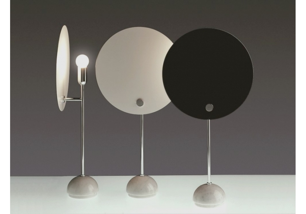 Kuta firmata da Vico Magistrettii per Nemo è una lampada da tavolo con base circolare in marmo bianco. Lo stelo e le minuterie sono in metallo cromato. Il riflettore è di forma circolare in alluminio verniciato bianco e nero e scherma una sorgente luminosa di tipo LED,alogeno o Fluo dimmerabile.