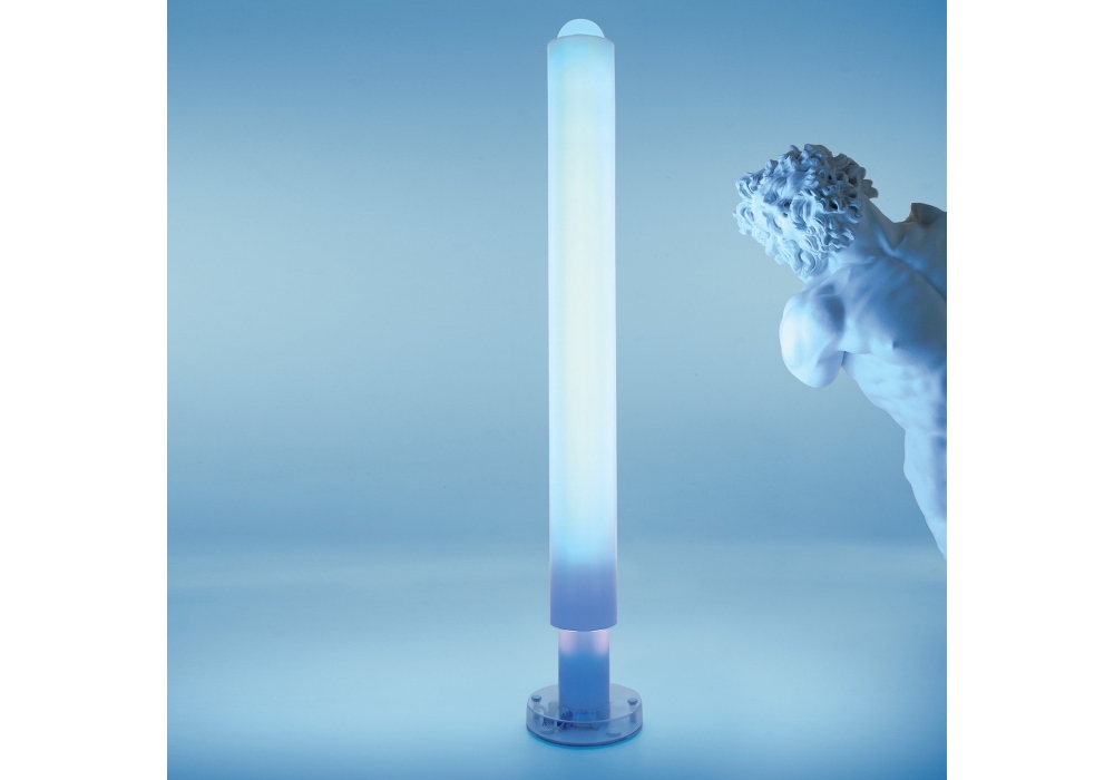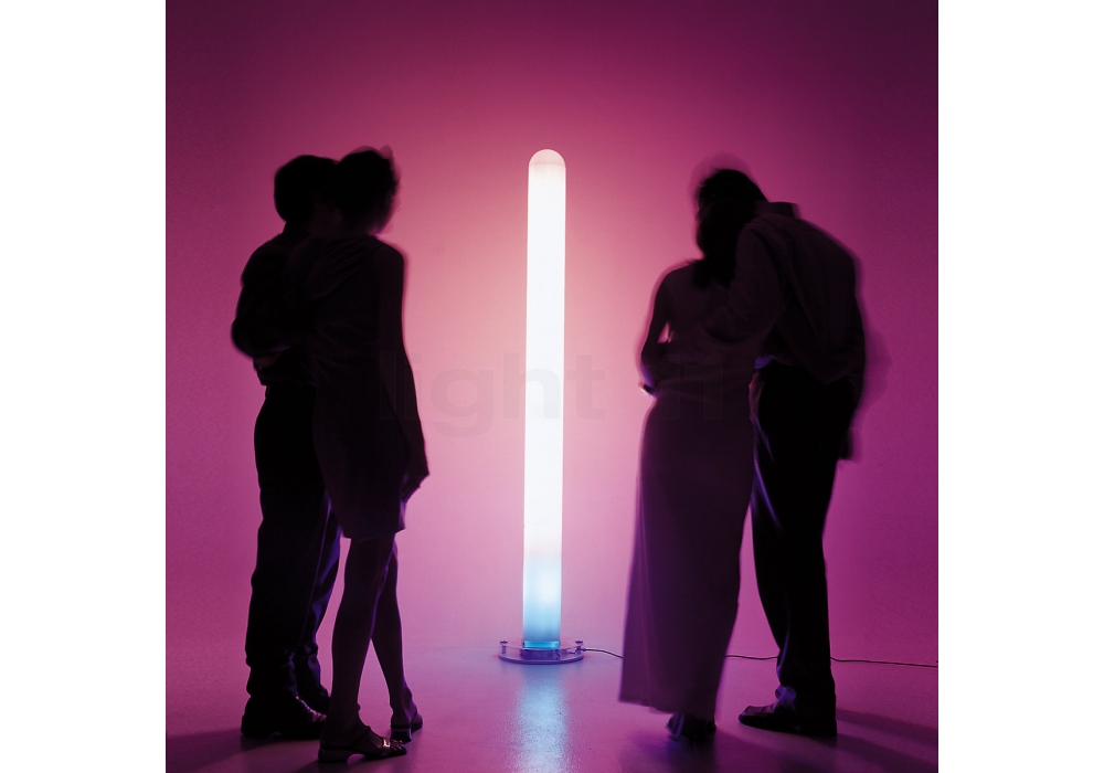 Metacolor firmata da Ernesto Gismondi per Artemide è una lampada da terra Lampada da terra con base in acciaio. Il diffusore è di forma cilindrica in acrilico opalino che utilizza la tecnologia di sorgenti RGB, in grado di ottenere infinite atmosfere di illuminazione. Grazie al suo comando remoto è possibile gestire 10 illuminazioni gia preimpostate, e poterne registrare altre 10 agendo su intensita, colore e luminosità. Sulla base vi è posto un display che indica il tipo di atmosfera momentaneamente selezionata.