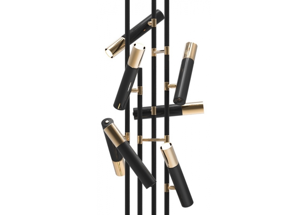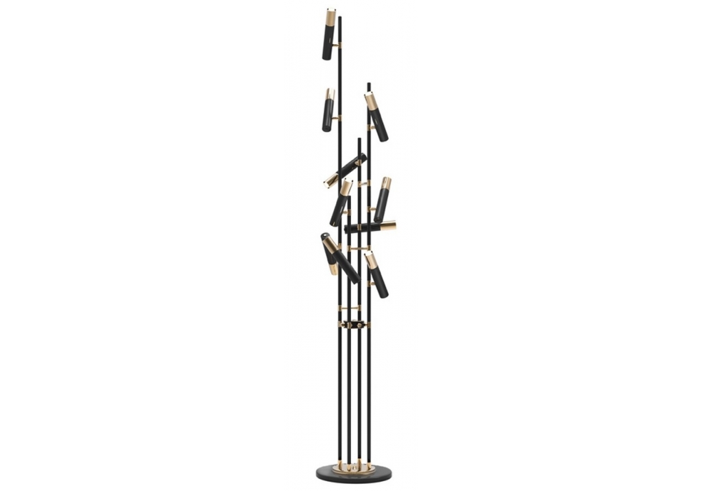 Ike 10 firmata da DelightFULL è una lampada da terra con una struttura realizzata in ottone con dieci paralumi con finiture nere lucide e placcate oro.