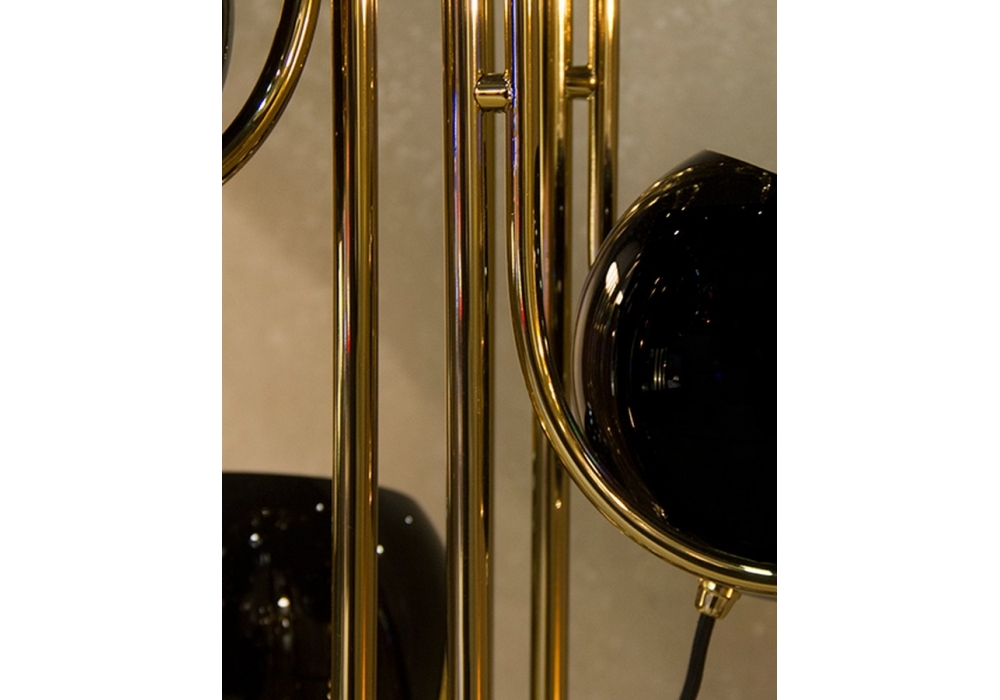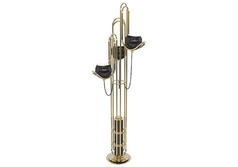 Neil firmata da DelightFULL è una lampada da terra con la base in ottone che si estende in tre paralumi con finitura nera lucida. I tre bracci con luci flessibili forniscono una buona portata di luce periferica.