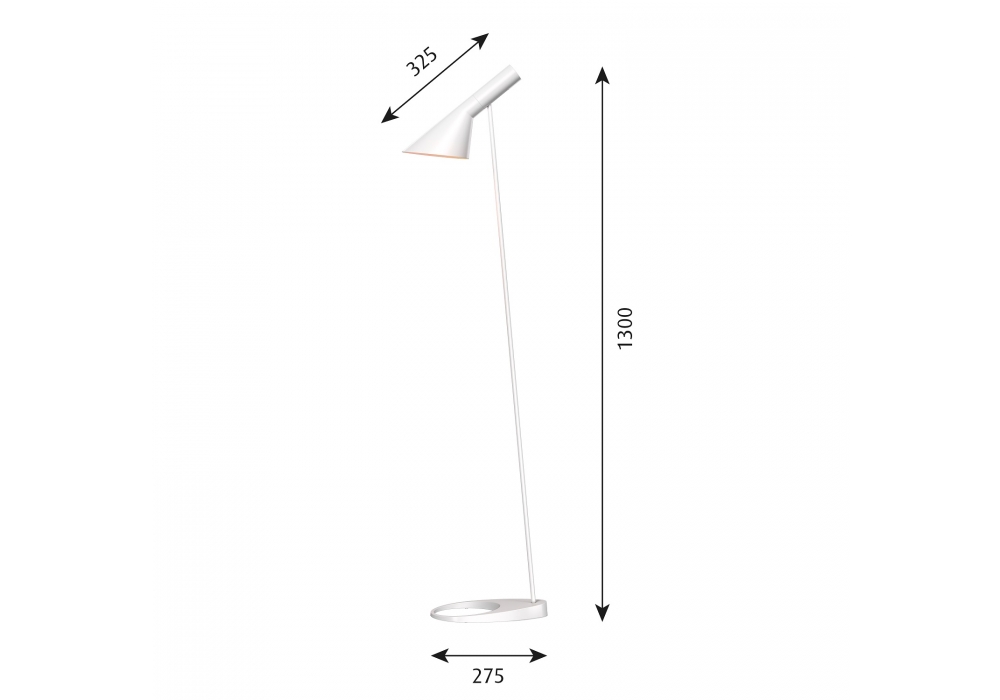 AJ firmata da Arne Jacobsen per Louis Poulsen è una lampada da terra con base in zinco o acciaio inox e sostegno in acciaio inox verniciato. Il diffusore è in acciaio inox e scherma una sorgente luminosa con innesto E27 di tipo LED o alogeno. AJ è disponibile in differenti finiture.