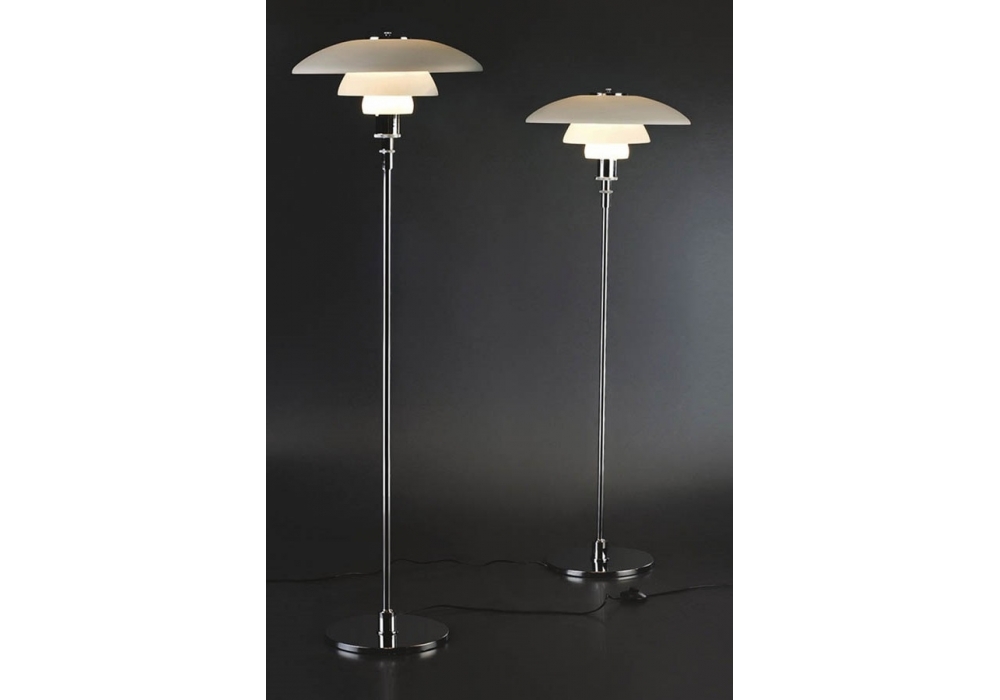 PH 4½-3½ Glass firmata da Poul Henningsen per Louis Poulsen è una lampada da terra con base circolare in ottone tirato ed asta tubolare in acciaio entrambi cromati. I diffusori sono in vetro opalino bianco e schermano una sorgente luminosa con innesto E27 di tipo LED o alogeno.
