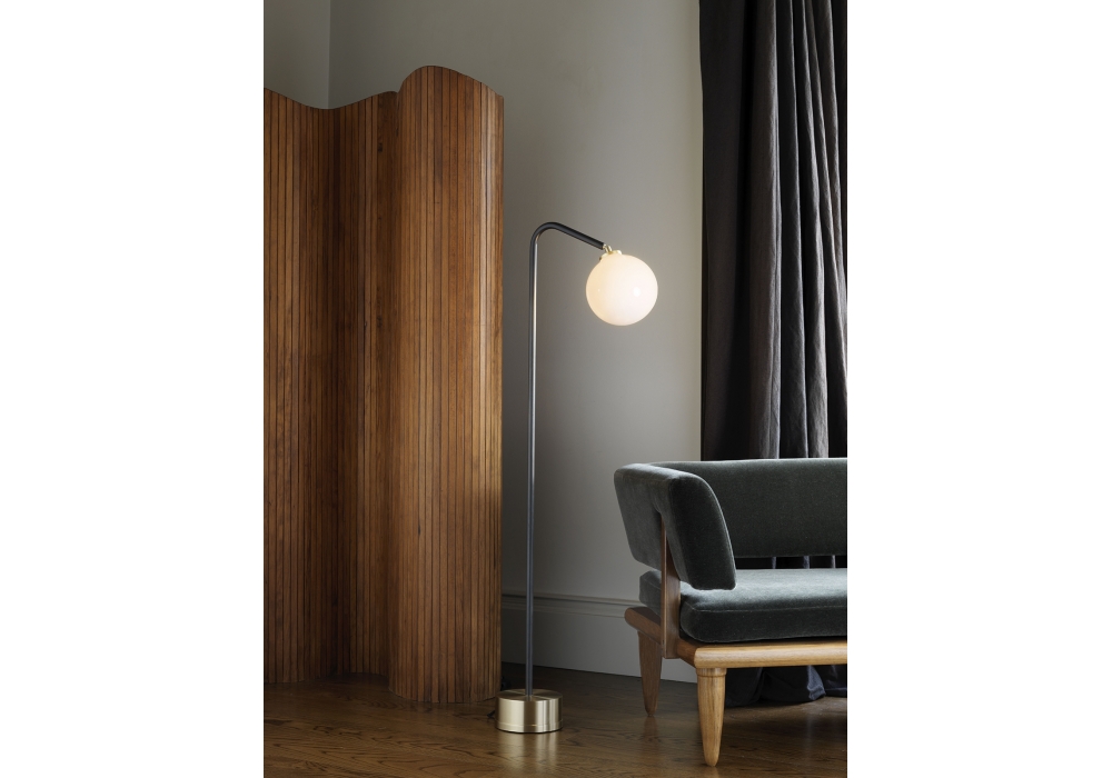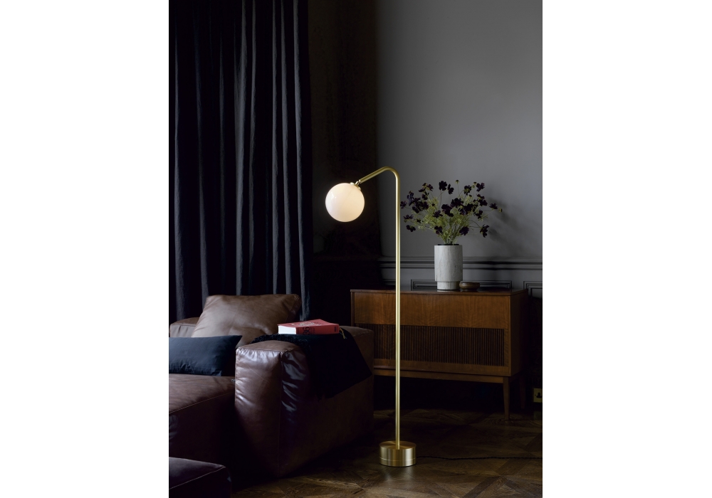 Oscar firmata da CTO Lighting è una lampada da terra realizzata base in ottone satinato, stelo in ottone satinato o bronzo e diffusore in vetro opalino.