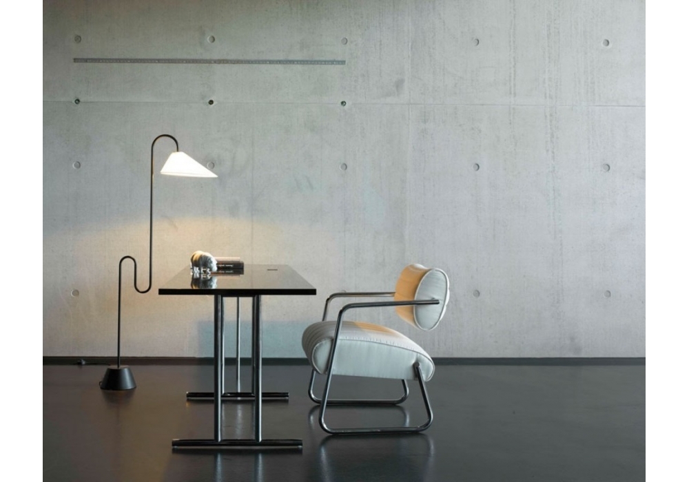 Roattino firmata da Eileen Gray per ClassiCon è una lampada da terra con base in tubolare d'acciaio e struttura a forma di S, laccato nero o bianco panna. Testa della lampada orientabile orizzontalmente. Paralume in tessuto bianco, plastificato all'interno. Interruttore a pedale, dimmerabile.