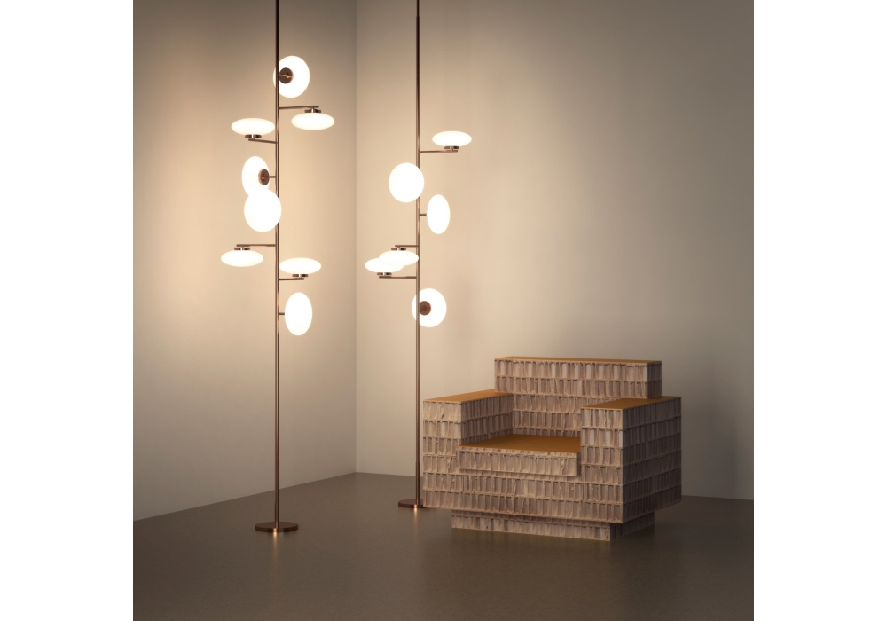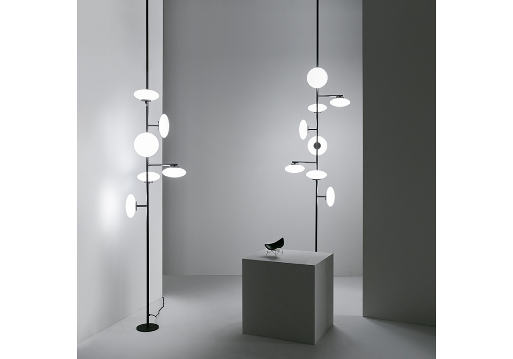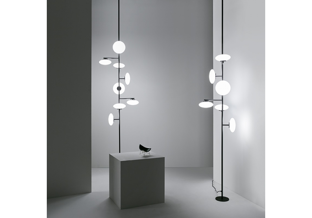 Mamì firmata da Umberto Asnago per Penta è una lampada da terra/soffitto estensibile con struttura in metallo grafite opaco o bronzo spazzolato. I diffusori di forma circolare sono in vetro soffiato bianco e schermano una sorgente luminosa di tipo LED dimmerabile. Mamì è disponibile in differenti dimensioni.