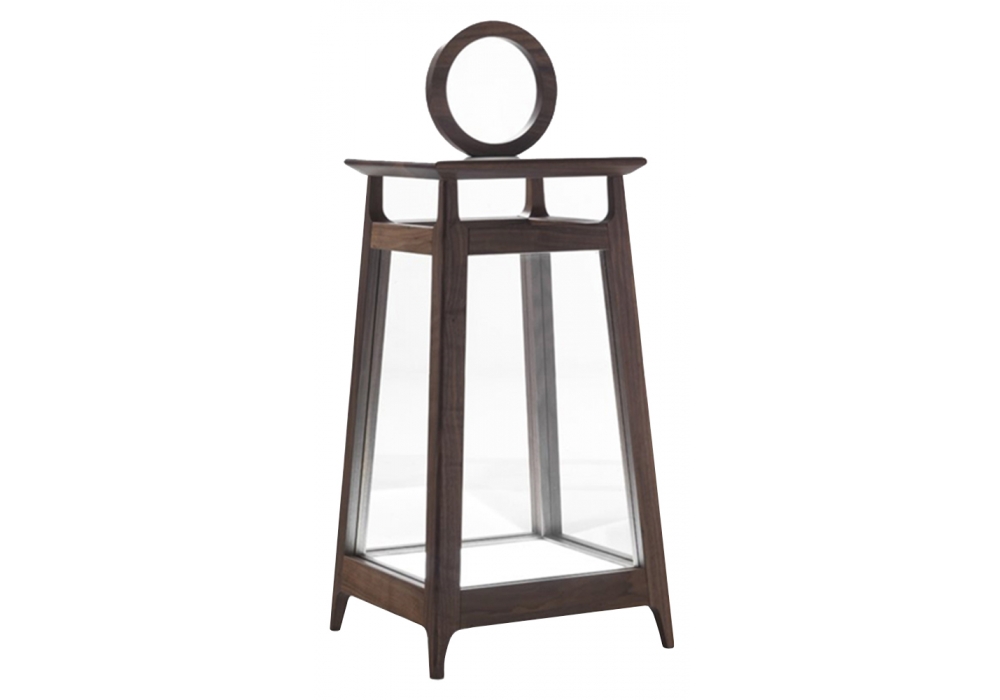Amarcord firmata da P. Salvadé per Porada è una lampada da terra con struttura in noce canaletta e pannelli in cristallo trasparente. Base con illuminazione a LED 3000° K.