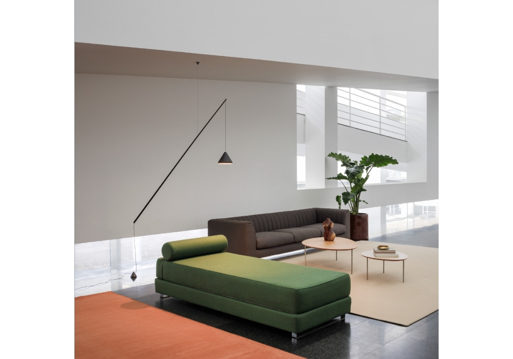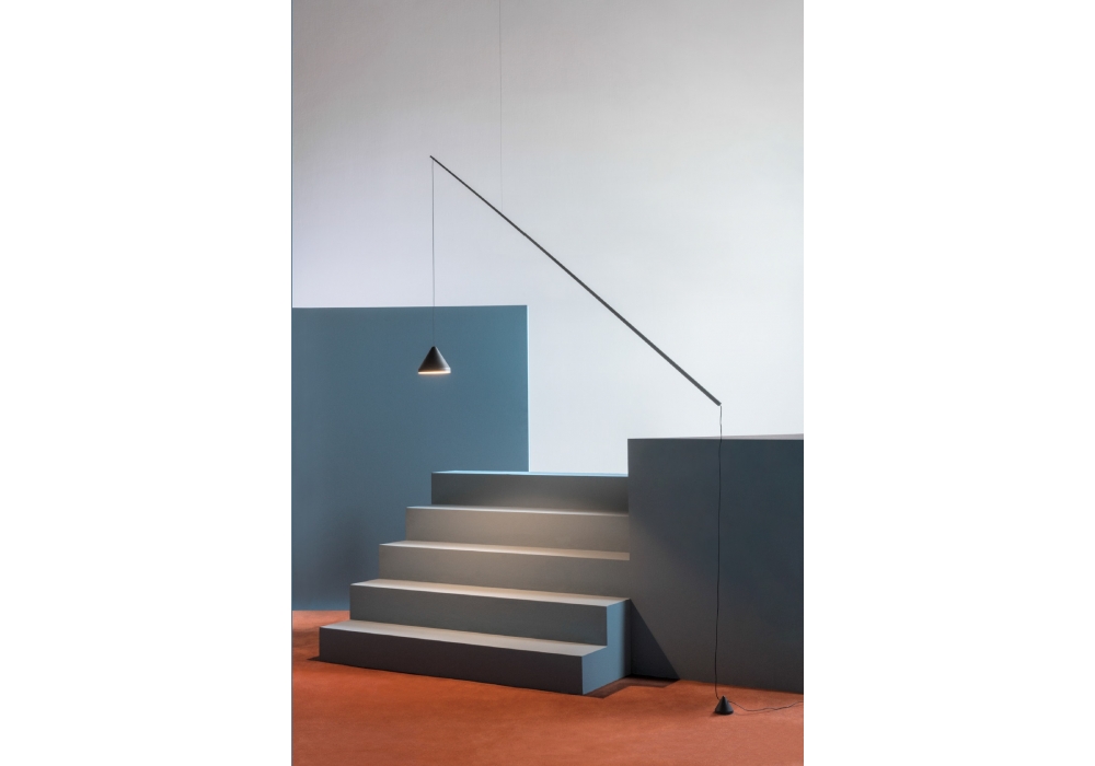 North firmata da Arik Levy per Vibia è una lampada da terra/sospensione con asta in acciaio tubolare verniciata con contrappeso per il bilanciamento in alluminio. Il paralume è in alluminio ed adotta un diffusore in metacrilato che scherma una sorgente luminosa di tipo LED con switch on/off. North è disponibile in differenti finiture.