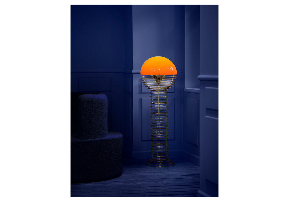 Wire firmata da Verner Panton per Verpan è una lampada da terra con una struttura metallica cilindrica che si espande superiormente in forma emisferica. Diffusore in plastica bianca o arancione.