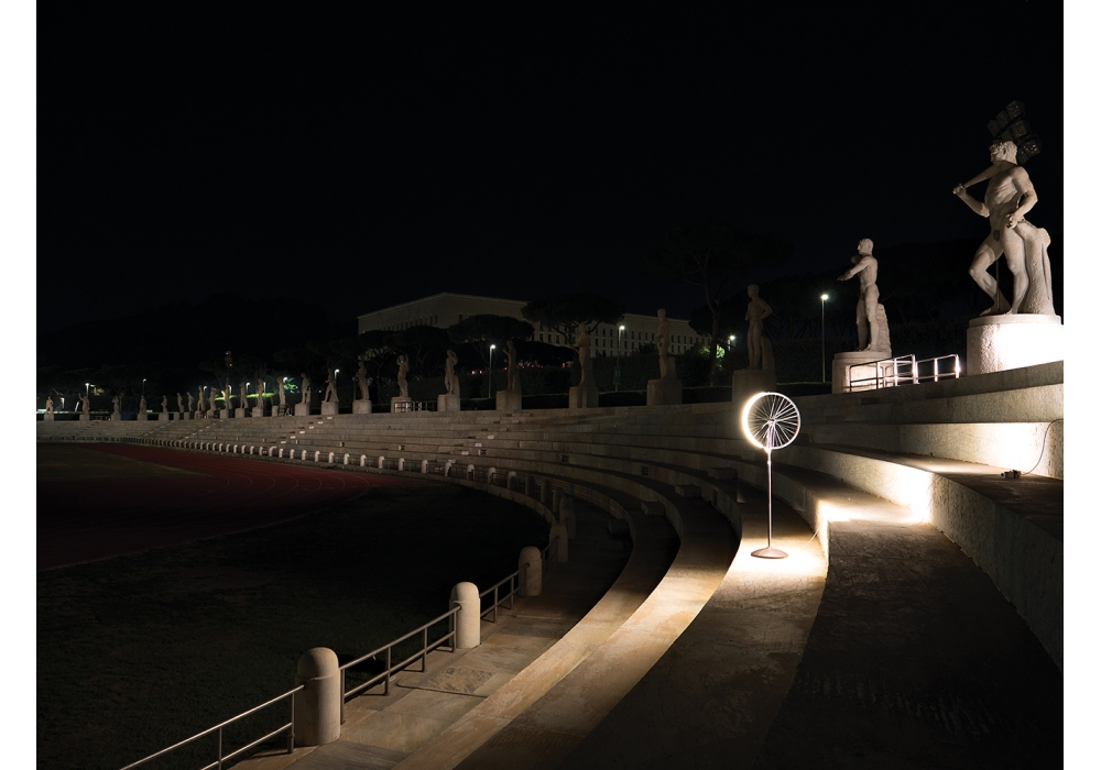 Fausto firmata da Fabio Antinori per Cyclampa è una lampada da terra in alluminio. La lampada è composta da una ruota della biciletta originale in alluminio pressofuso. Ledstrip ad alta capacità, dotato di chip di controllo termico integrato. Corpo in acciaio cromato (componente originale della forcella), interruttore a sfioro, cappuccio in alluminio con rivestimento in ecopelle di alta qualità cucito a mano.