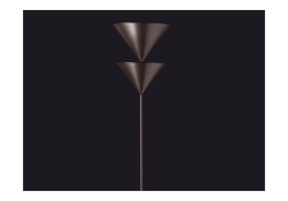 Pascal firmata da Vico Magistretti per Oluce è una lampada da terra con base circolare in metallo e struttura verticale in alluminio verniciati color bronzo. I diffusori sono di forma conica sovrapposti uno all'altro e schermano delle sorgenti luminose.