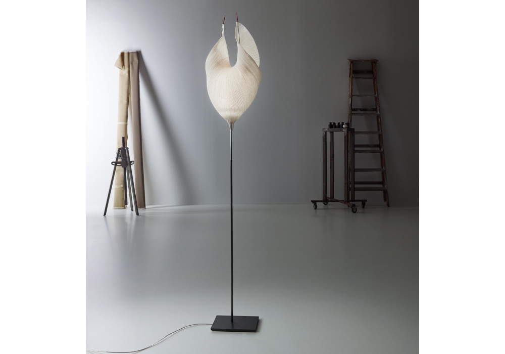 Babadul firmata da Ingo Maurer è una lampada da terra con LED integrati e dimmer. È costituita da una base in acciaio inox e paralume in carta naturale giapponese che viene allungata in modo circolare su fili sottili di metallo.