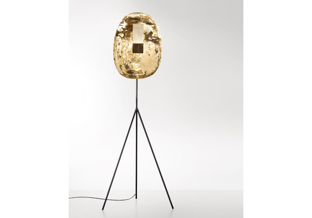 Ribot firmata da Alessandro Mason per DeCastelli è una lampada da terra a LED realizzata con paralume in ottone lucido e struttura in ferro.
