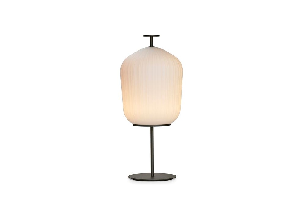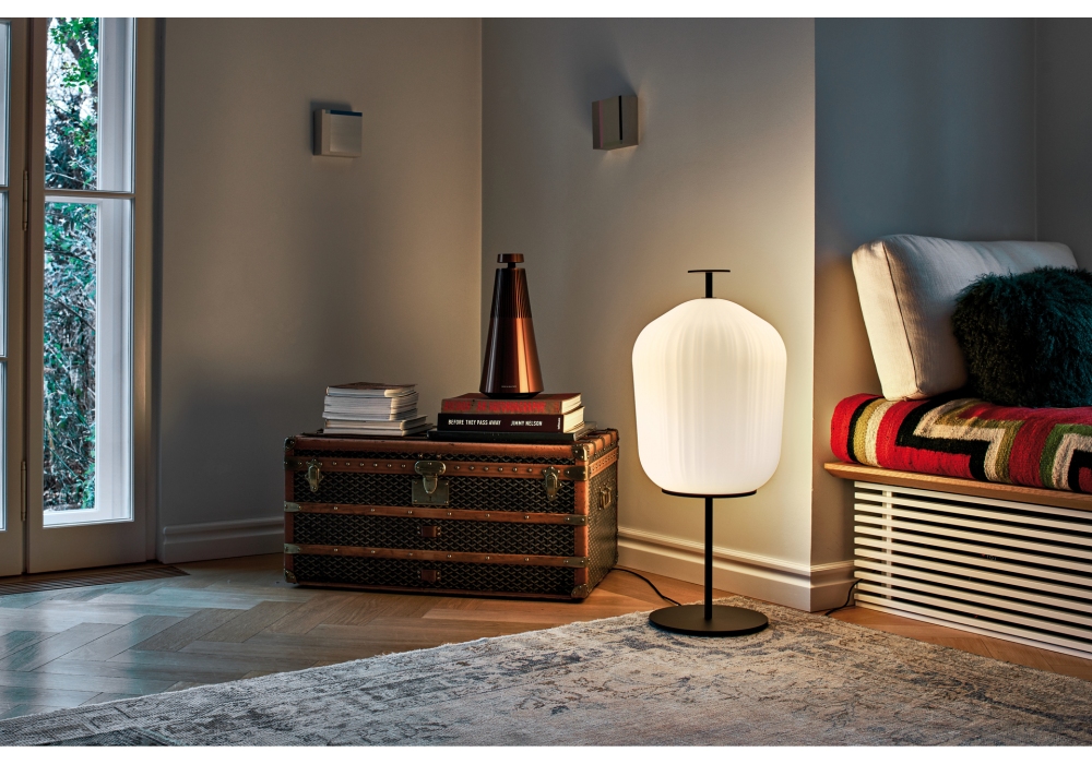 Plissée firmata da Sebastian Herkner per ClassiCon è una lampada da terra realizzata con struttura in alluminio. Paralume in vetro opalino satinato bianco soffiato a mano con superficie plissettata. Interruttore a pressione integrato nella parte superiore del telaio. Alianti in feltro nero.