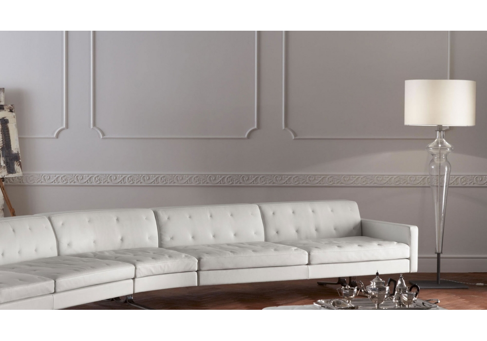 Holly firmata da Jean-Marie Massaud per Poltrona Frau è una lampada da terra con base in metallo verniciato, stelo in metallo verniciato rifinito con sagoma esterna in vetro trasparente e paralume a doppio strato con tela all'esterno e PVC all'interno.
