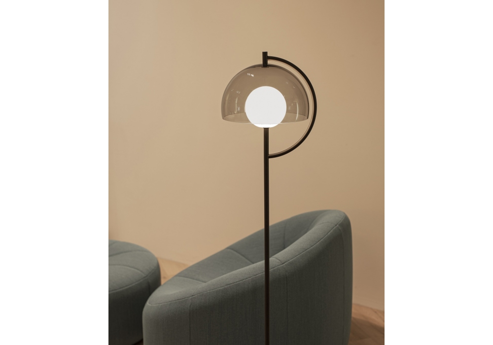 Hood firmata da Andreas Kowalewski per Ligne Roset è una lampada da terra LED con base e struttura in acciaio laccato epossidico strutturato nero satinato, RAL 9005. Diffusore sferico in vetro opale soffiato. Paralume semisferico in vetro soffiato a mano trasparente tinto grigio. Cavo elettrico in tessuto nero.