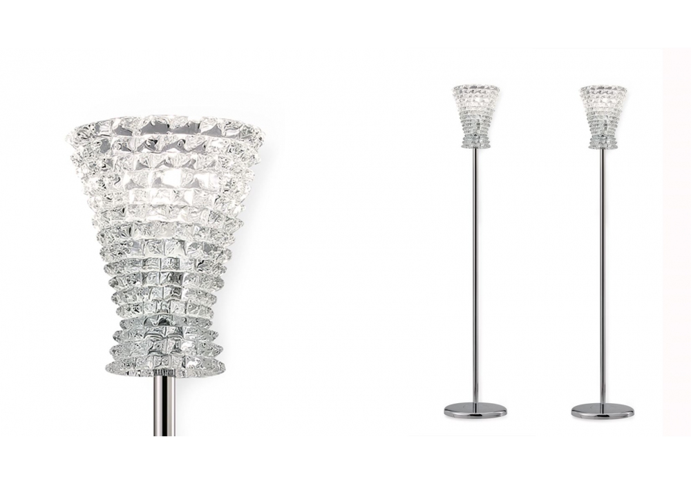 Ercole firmata da Barovier & Toso è una lampada da terra con base circolare e stelo vertricale in metallo cromato. Il diffurose è in cristallo veneziano trasparente impreziosito da piccole cuspidi che creano una superficie irregolare e scherma una sorgente luminosa di tipo LED o alogena dimmerabile.