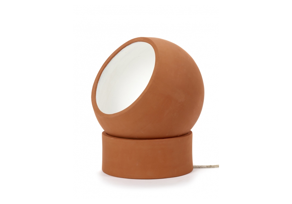 Terra firmata da Lauren Van Driessche per Serax è una lampada da terra, concepita interamente in terracotta. La base è di forma cilindrica, mentre la parte superiore è strutturata da una sfera orientabile, con superficie esterna color terracotta, e superficie interna di colore bianco. La sorgente luminosa adottata è di tipo alogeno (non inclusa).