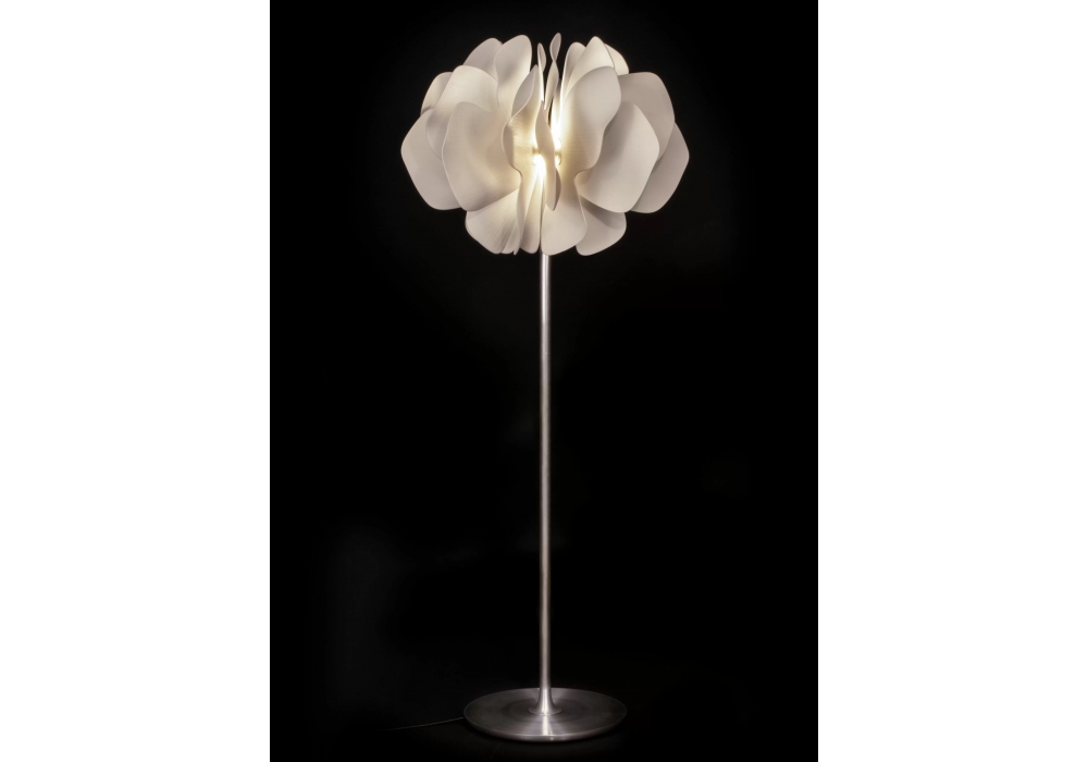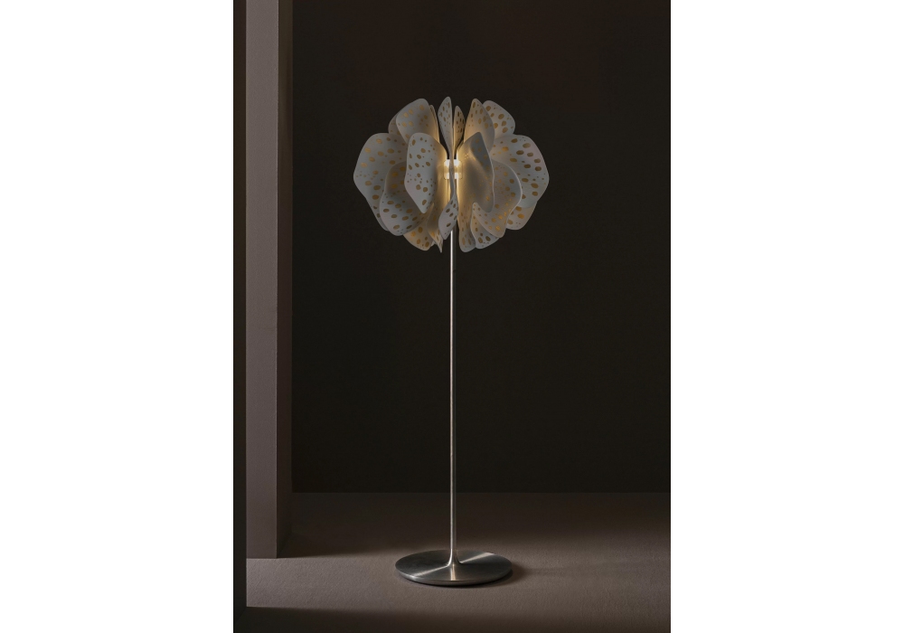 Nightbloom scolpita da Dept. Diseño y Decoración e firmata da Marcel Wanders per Lladró è una lampada da terra con base circolare e struttura portante tubolare in metallo. Il corpo diffondente è costituito da un insieme di petali in porcellana realizzati a mano. Nightbloom è disponibile in differenti finiture.