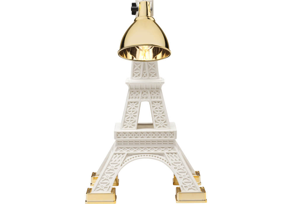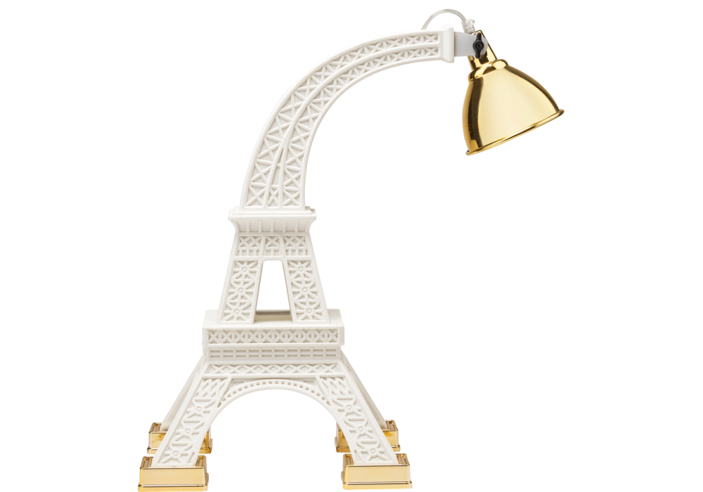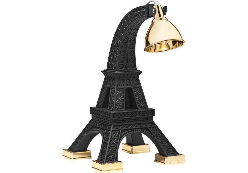 Paris XL firmata da Studio Job per Qeeboo è una lampada da tavolo in metallo e fibra di vetro verniciata di colore nero o bianco con particolari in ottone. Il diffusore è di forma a cupola orientabile in ottone.