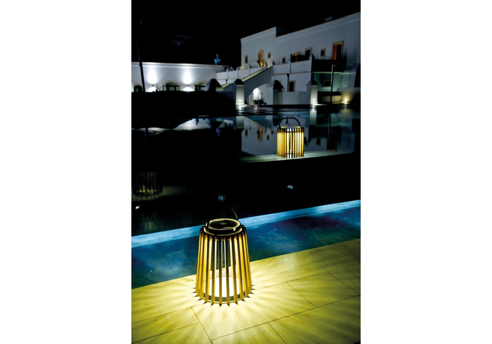 Solare prodotta e firmata da Unopiù è una lampada da terra o tavolo per esterni ricaricabile dotata di pannello solare e porta usb. Il corpo lampada è realizzato con listelli di legno teak ed alluminio. La sorgente luminosa adottata è di tipo LED dimmerabile a tre intensità. Solare è disponibile in differenti finiture.