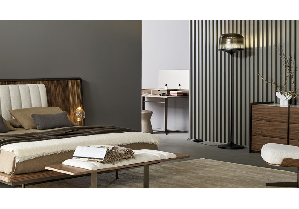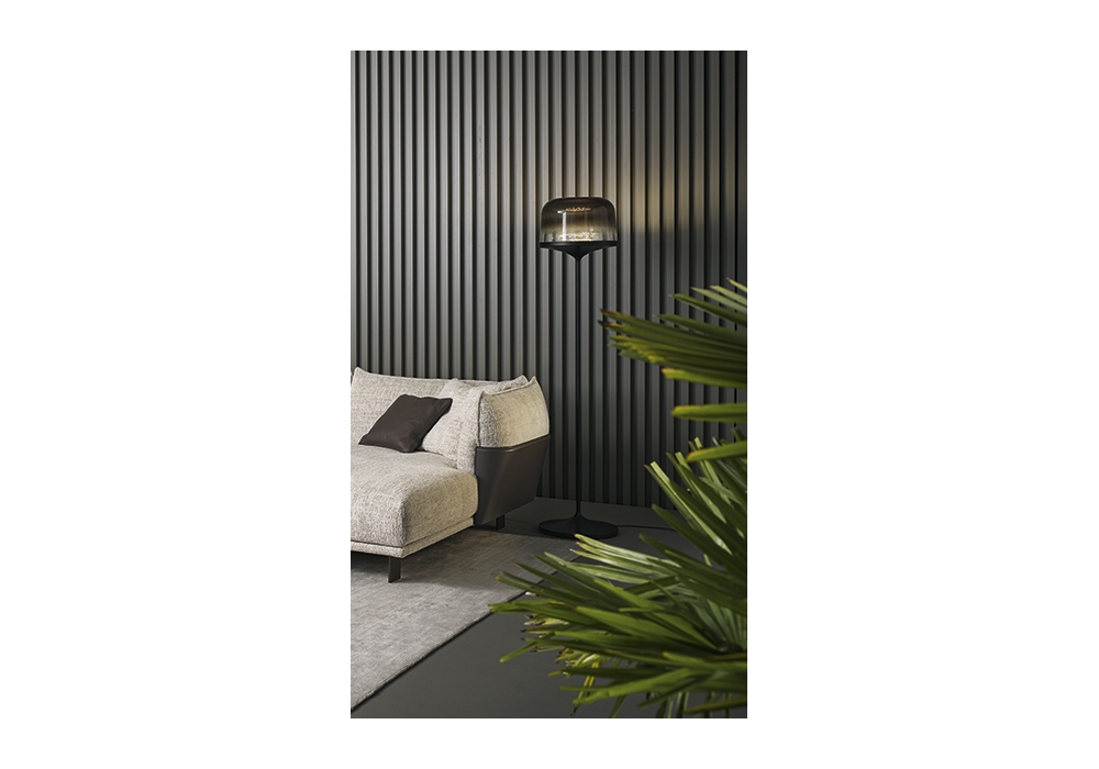 Pin firmata da Dondoli e Pocci per Bonaldo è una lampada da terra a LED dimmerabile, con paralume in vetro fumè e struttura in metallo color piombo.
