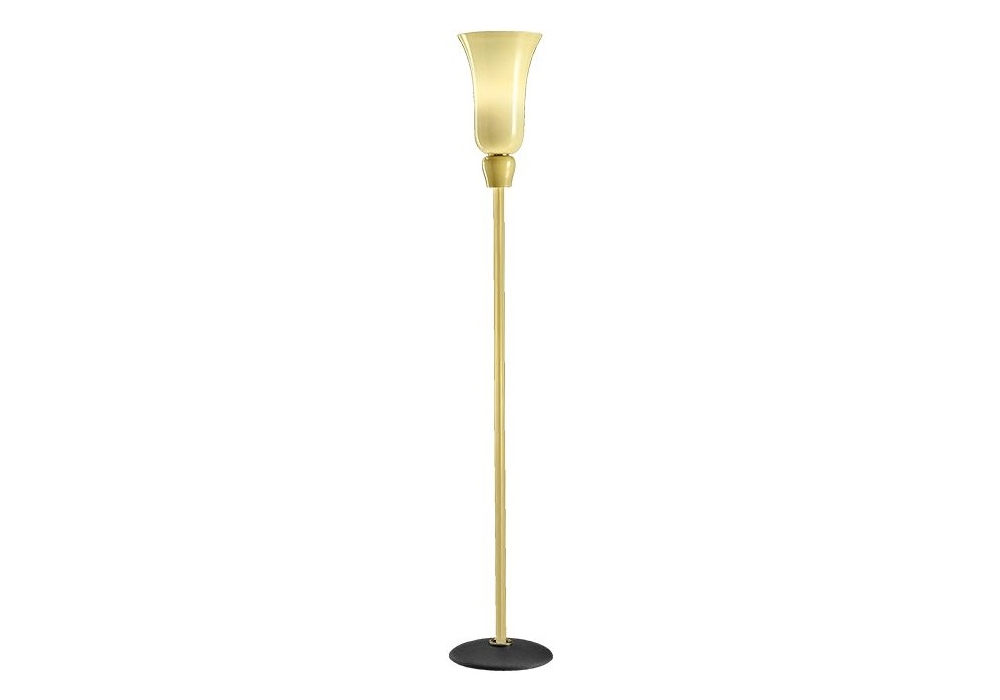 Anni Trenta firmata e prodotta da Venini è una lampada da terra con diffusore in vetro opalino soffiato e lavorato a mano. Disponibile in 2 colori: pagliesco (con struttura in metallo dorato) e lattimo (con struttura in metallo nichel nero).