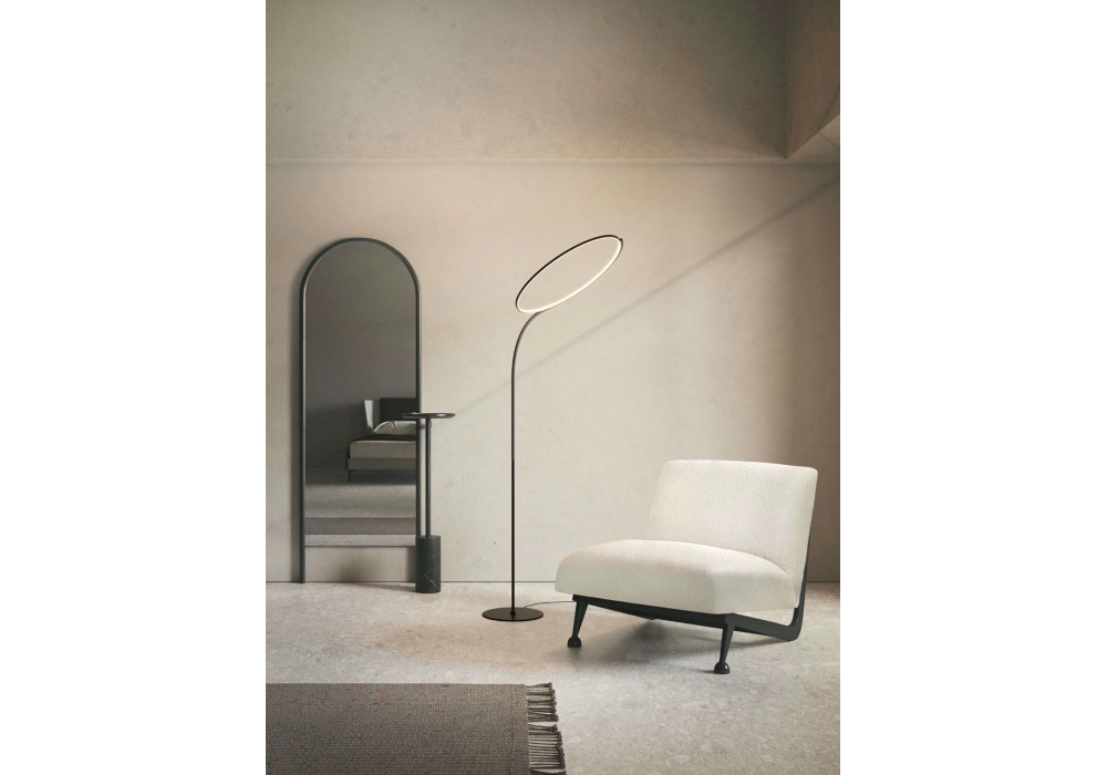 Poise firmata da Robert Dabi per Kundalini è una lampada da terra dimmerabile con tubo flessibile rivestito in tessuto tecnico.