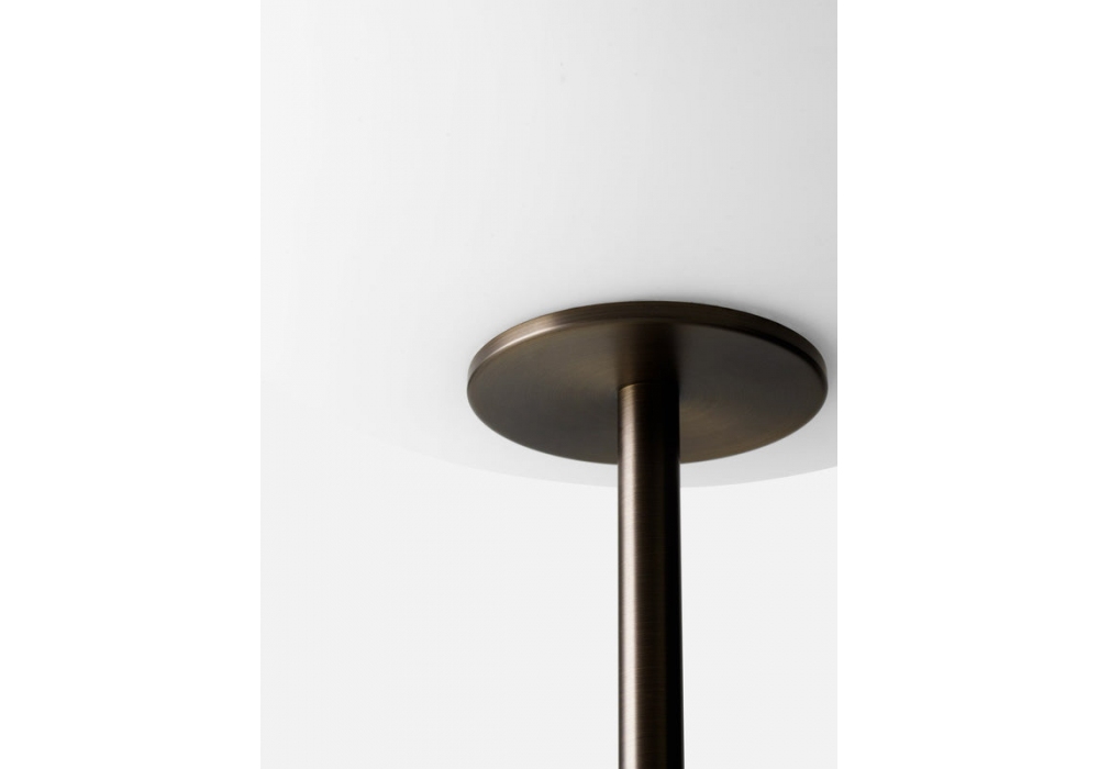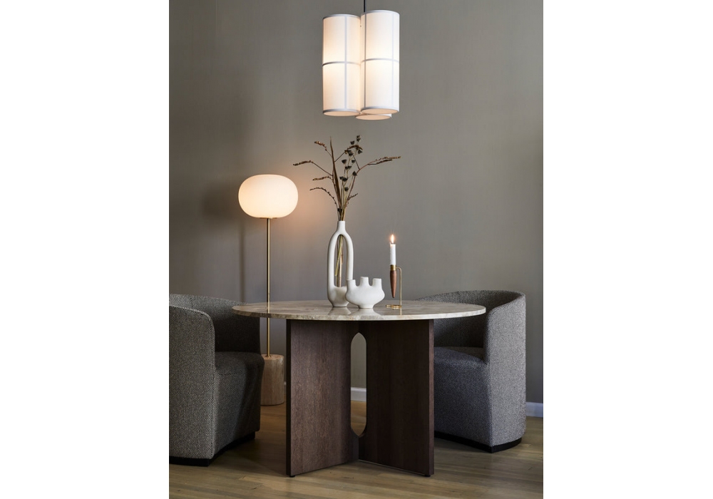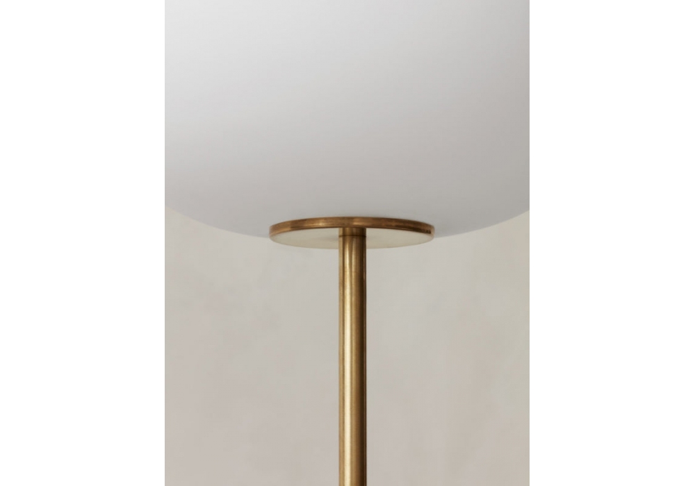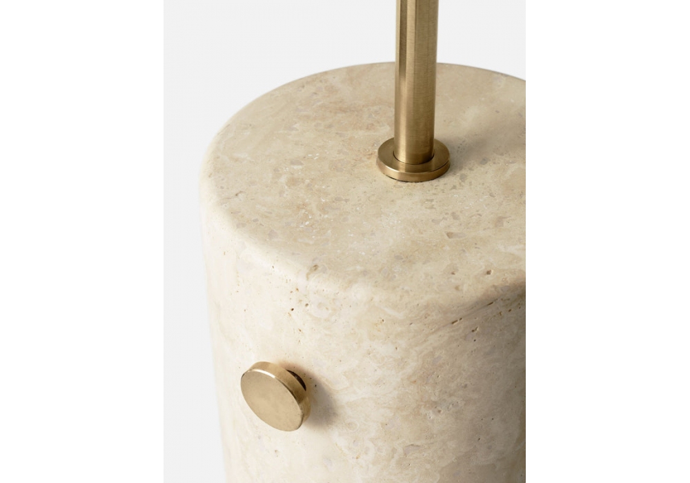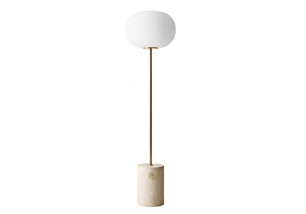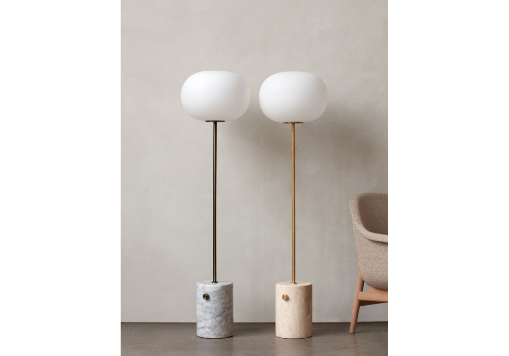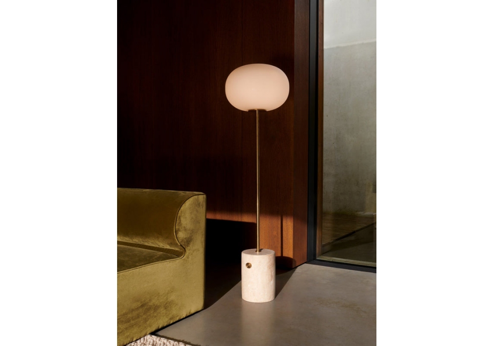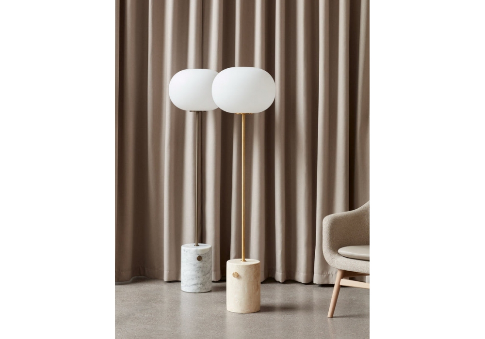 JWDA firmata da Jonas Wagell per Audo Copenhagen è una lampada da terra con base in travertino e parti metalliche in ottone spazzolato oppure in marmo Carrara con parti metalliche in ottone bronzato. Paralume in vetro opalino.