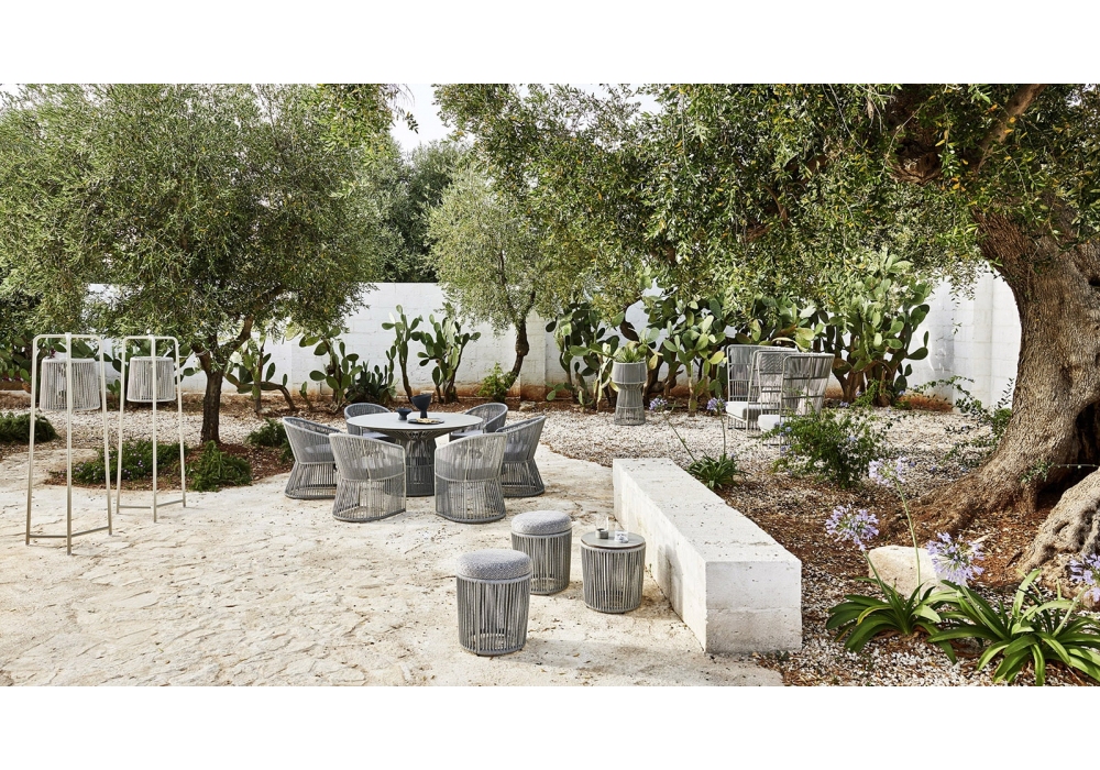 Tibidabo firmata da R&D per Varaschin è una lampada da terra con struttura in alluminio verniciato a polveri e paralume intrecciato a mano. Illuminazione LED. Disponibile in differenti finiture.