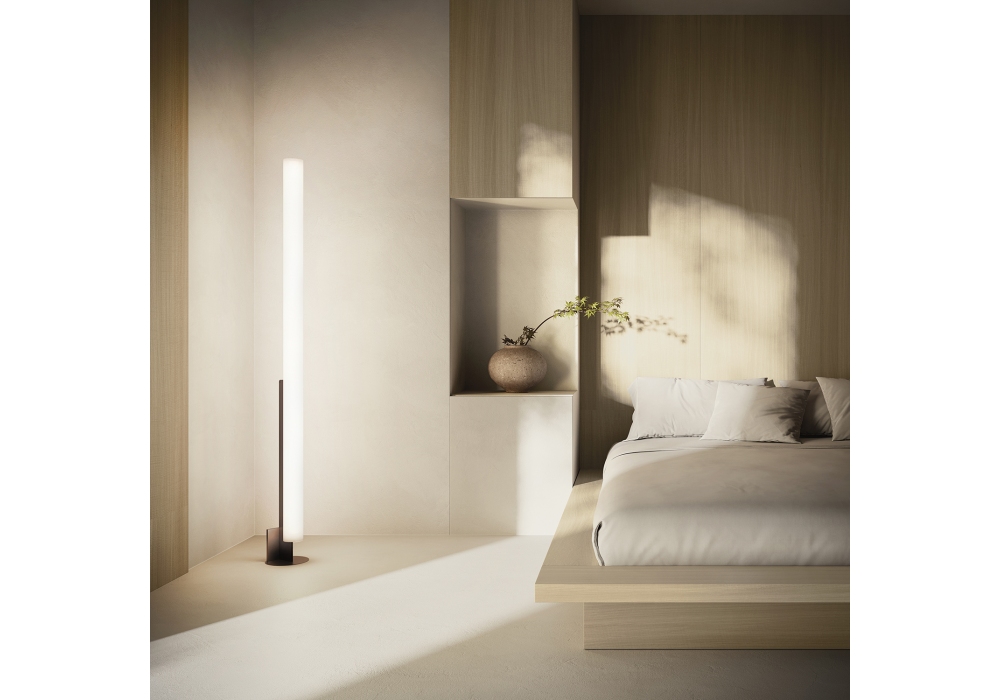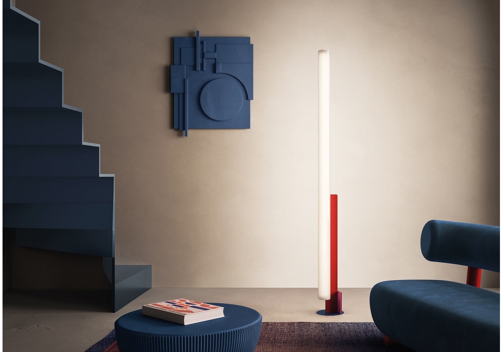 Model T firmata da Francesca Smiraglia per Kundalini è una lampada da terra dimmerabile con diffusore tubolare in metacrilato opalino e struttura in metallo verniciato.