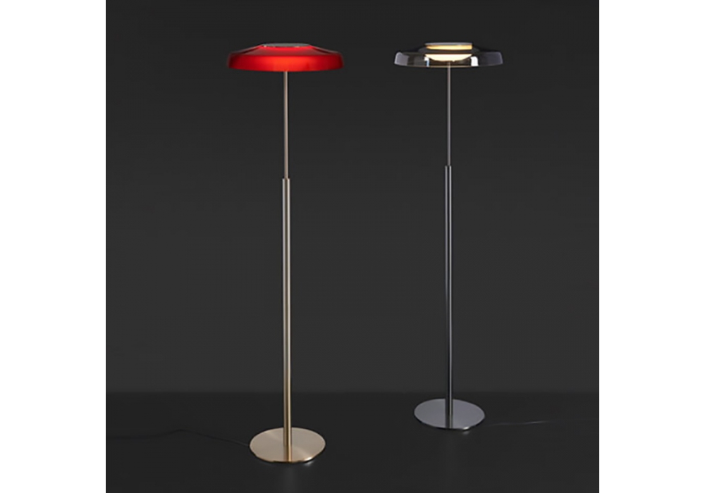 Dora firmata da Angeletti & Ruzza per Oluce è una lampada da terra con base circolare ed asta verticale in metallo verniciato oro satinato o nichel nero. Il paralume a cappello è in vetro ed adotta una sorgente luminosa di tipo LED dimmerabile. Dora è disponibile in differenti finiture.