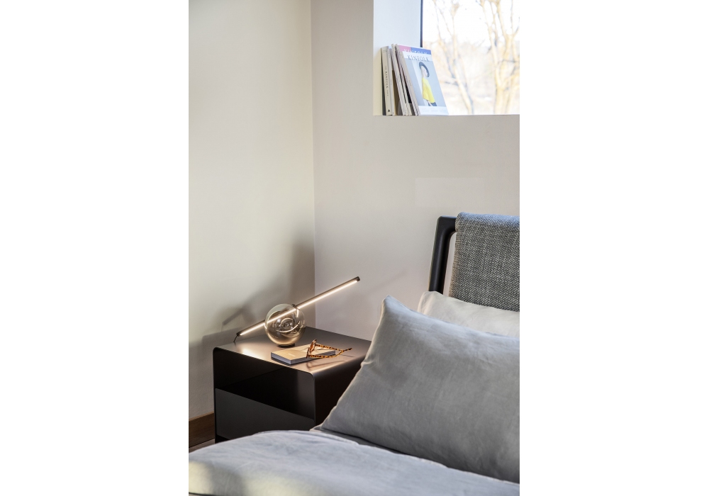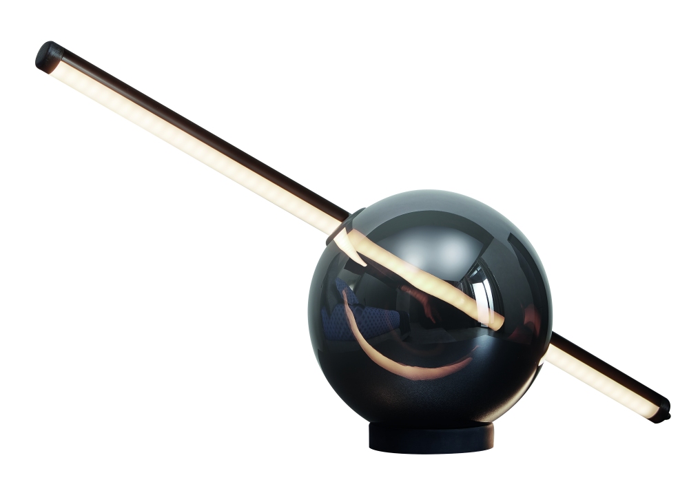 Rugiada firmata da Ilenia Viscardi per Natevo è una lampada da terra e da tavolo con base sferica in tre diverse misure. Il corpo illuminante è un’asta in metallo che incorpora luci a led e realizzata in 4 misure che permettono alla lampada di assolvere svariate funzioni e illuminare spazi di diverse dimensioni. Anello di supporto della base in metallo rivestito con materiale plastico nero.
