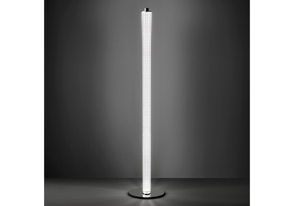 ex-Tr firmata da Franco Raggi per Firmamento Milano è una lampada da terra a luce diffusa realizzata in acciaio cromato e vetro estruso borosilicato trasparente o satinato.