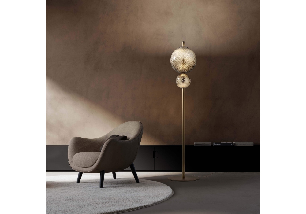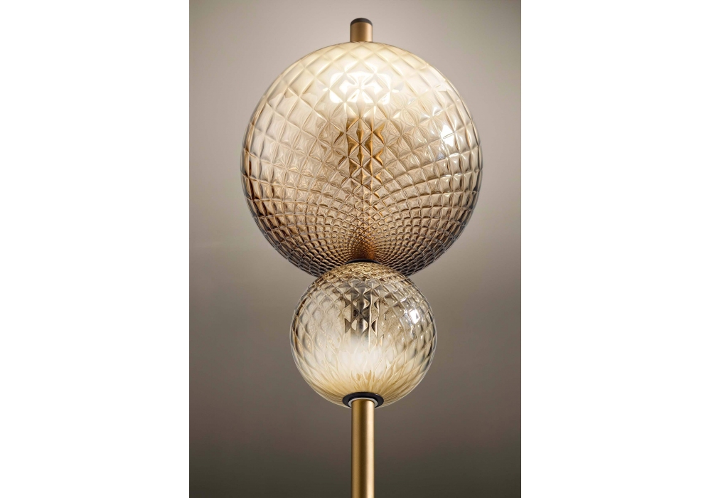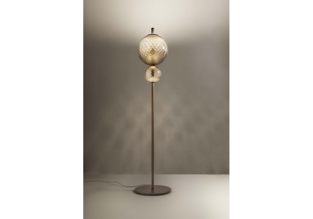 Terra & Luna PT firmata da Olev è una lampada da terra realizzata in alluminio e vetro soffiato realizzato a mano.