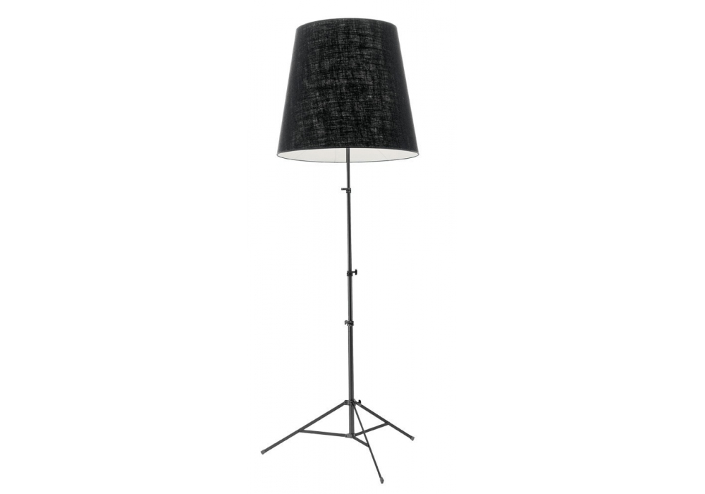 Gilda Black firmata da Enrico Franzolini per Pallucco è una bellissima lampada da terra caratterizzata da un asta verticale regolabile in altezza ed una base a tre piedi intereamente realizzati in alluminio verniciati di colore nero. Il paralume è di forma circolare in tessuto nero e scherma una sorgente luminosa con innesto E27 di tipo LED o Alogena.