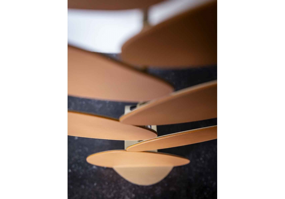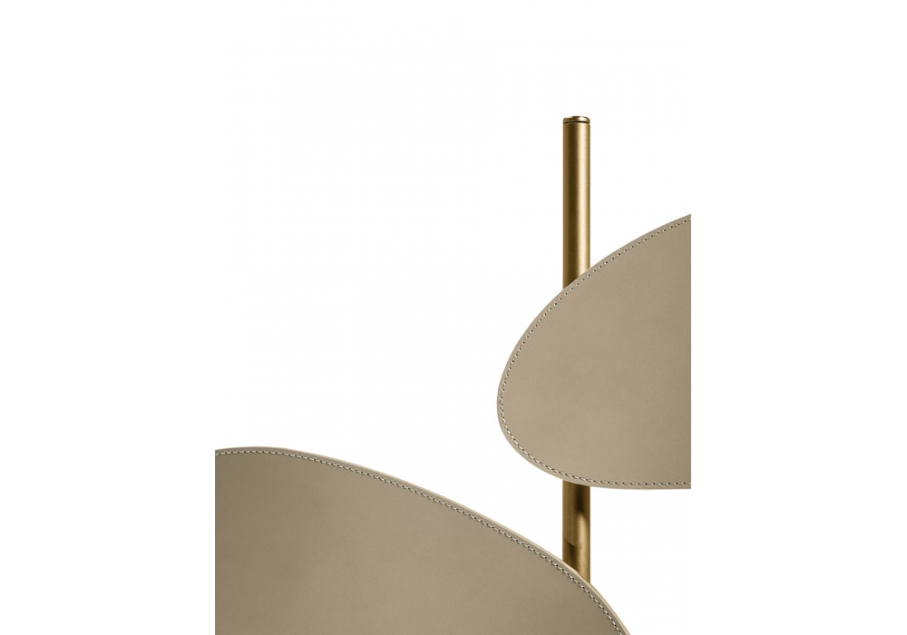 Foliage firmata da Six N. Five per Poltrona Frau è una lampada da terra costituita da un basamento in ottone su cui si sviluppa un “albero” stilizzato, sempre in ottone, con le foglie rivestite in Pelle Frau®. Grazie a un sistema innovativo creato appositamente da Poltrona Frau, la luce viene emessa dal basso e crea l’illusione di un effetto “silhouette” delle foglie, che si riverbera sulle pareti circostanti.