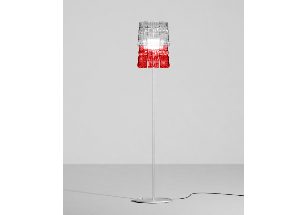Fracchi firmata da Michele De Lucchi per Venini è una lampada da terra con struttura metallo cromato e paralume in cristallo trasparente o rosso.