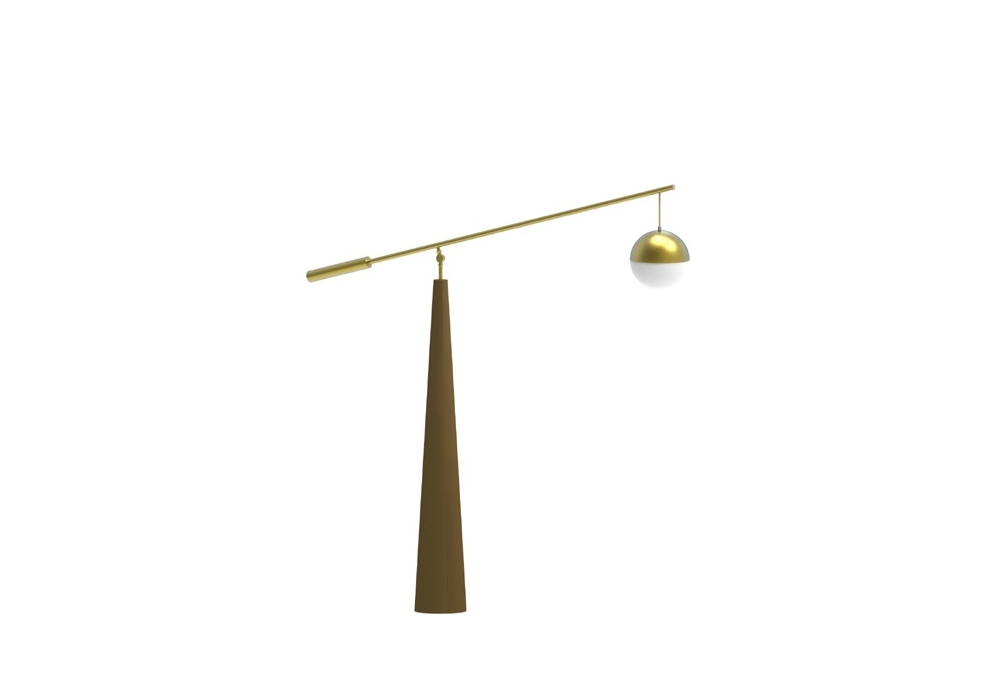 Dolly - PT firmata da Riflessi è una lampada da terra realizzata con base conica in metallo verniciato, braccetto regolabile in altezza in metallo verniciato ottone lucido. Bulbo in vetro bianco satinato, cavo elettrico in tessuto oro.