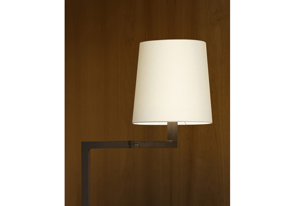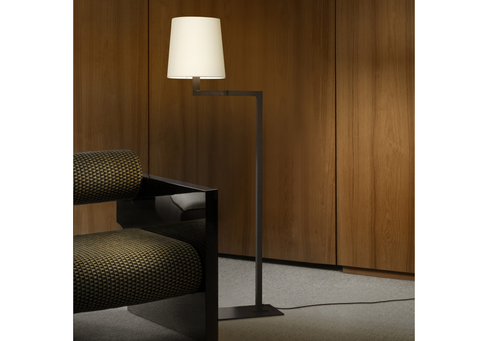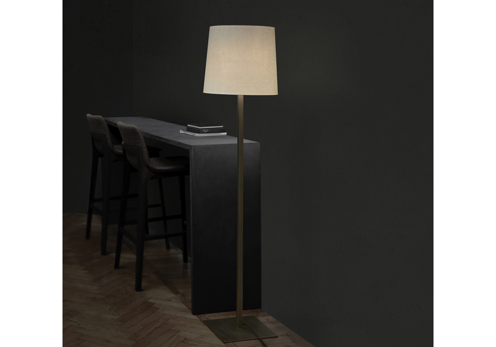 Heritage firmata da Contardi è una lampada da terra con struttura in bronzo spazzolato e paralume in lino bianco.