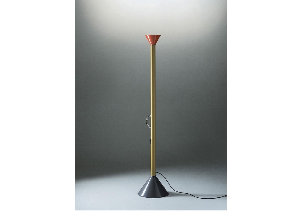 Callimaco Led firmata da Ettore Sottsass per Artemide è una lampada da terra con base di forma conica e corpo lampada in acciaio tubole verniciata multicolore. Il diffusore è sempre di forma conica in alluminio ed alloggia una sorgente luminosa di tipo LED (inclusa) con fonte luminosa dimmerabile.