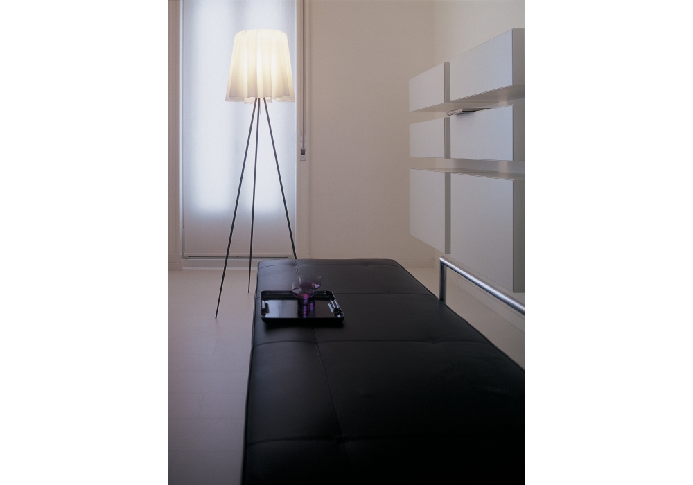 Rosy Angelis firmata da Philippe Starck per Flos è una lampada da terra a tre piedi strutturata con la combinazione di alluminio e policarbonato espanso. Il diffusore è in tessuto ultraleggero. Dimmer incluso. Lampadina esclusa.