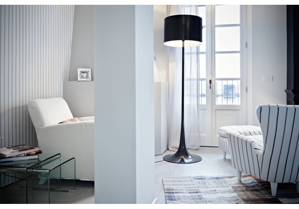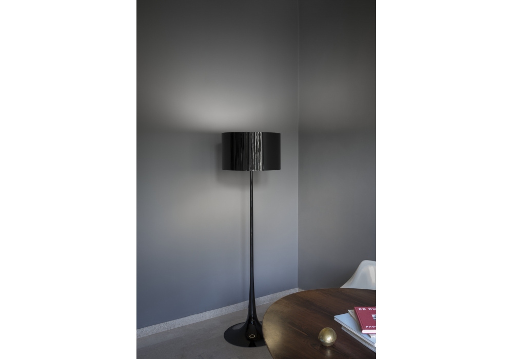 Spun Light F firmata da Sebastian Wrong per Flos è una lampada da terra con base, corpo e diffusore in metallo tornito in lastra verniciati. Il diffusore è di forma circolare ed adotta una sorgente luminosa di tipo LED con sistema di dimmerabilità su cavo di alimentazione. Lampadina esclusa.
